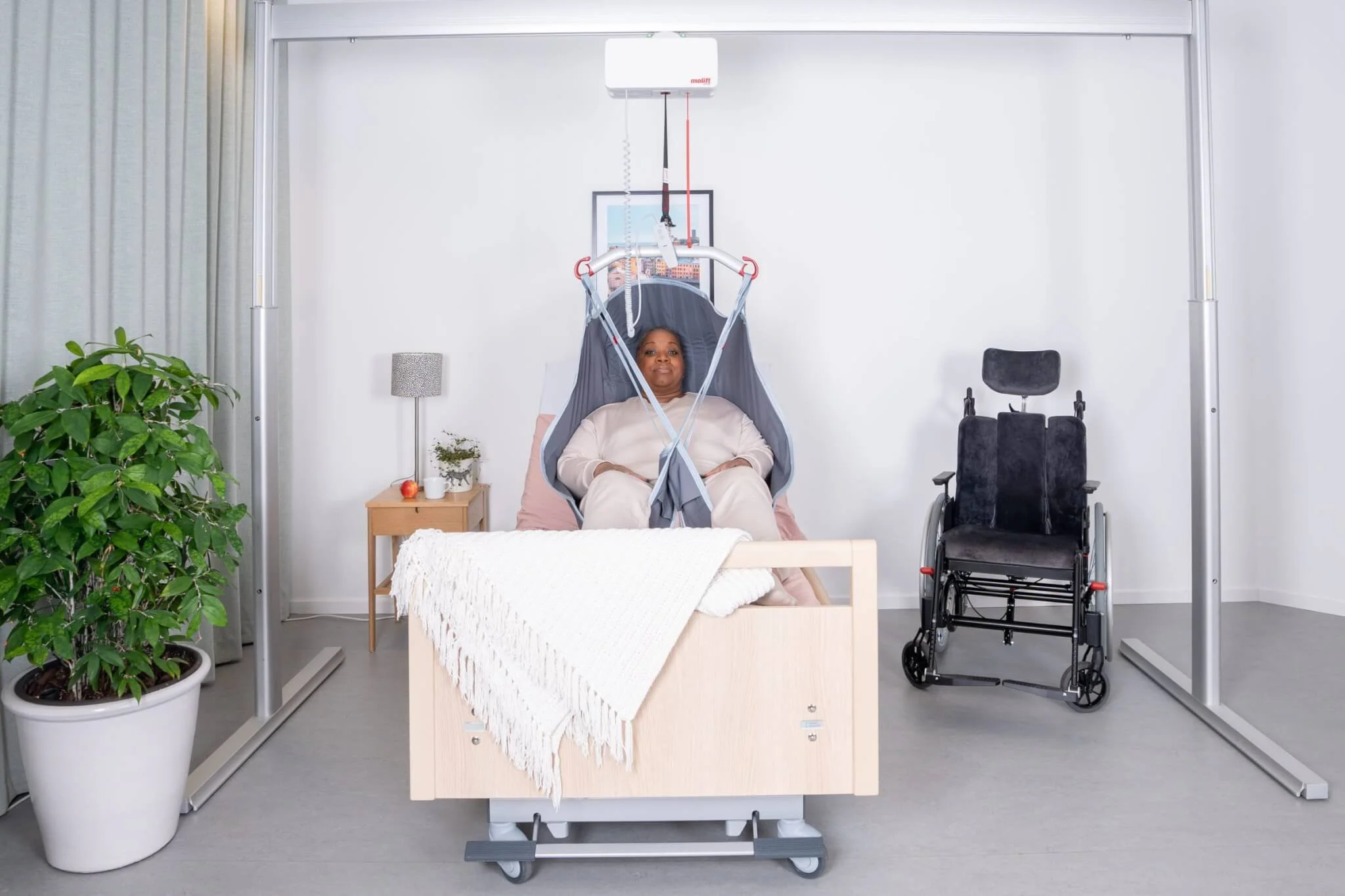 A ceiling-mounted lift allows seamless movement between predefined areas. Someone can be transferred from bed to wheelchair, then along a track into the bathroom without interruption. The motion feels continuous, almost effortless.